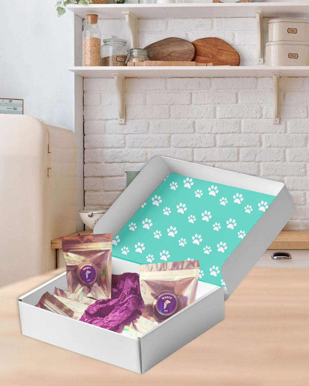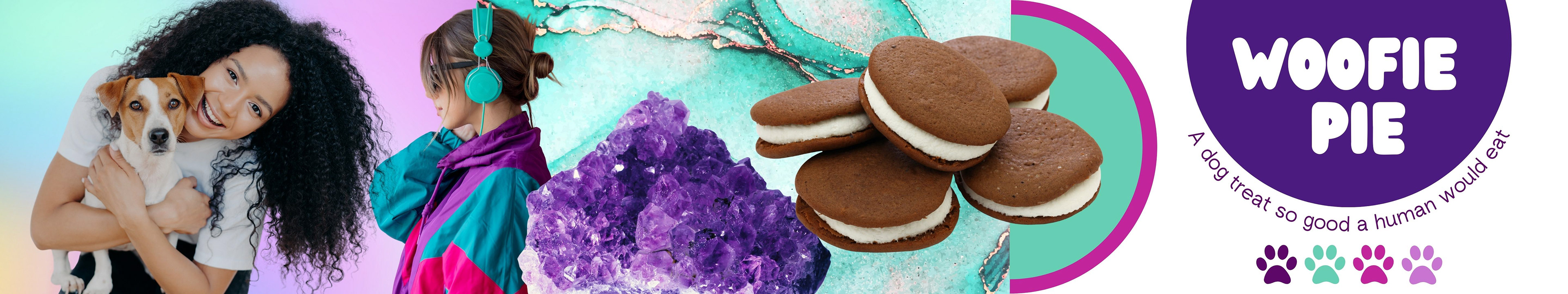 As its founder, I built Woofie Pie from the ground up. After perfecting the recipe for a "dog treat so good a human could eat," I began to build the brand. With the dog who inspired the business as the muse for its logo, and a target audience of Millennial dog parents in mind, I traveled back in time, creating a mood board that drew inspiration from the late 90s. The branding was informed by colors, elements, and textures from my own childhood to create a sense of nostalgia, featuring bright colors and the bubble font nearly every Millennial middle schooler practiced on their Trapper Keeper.